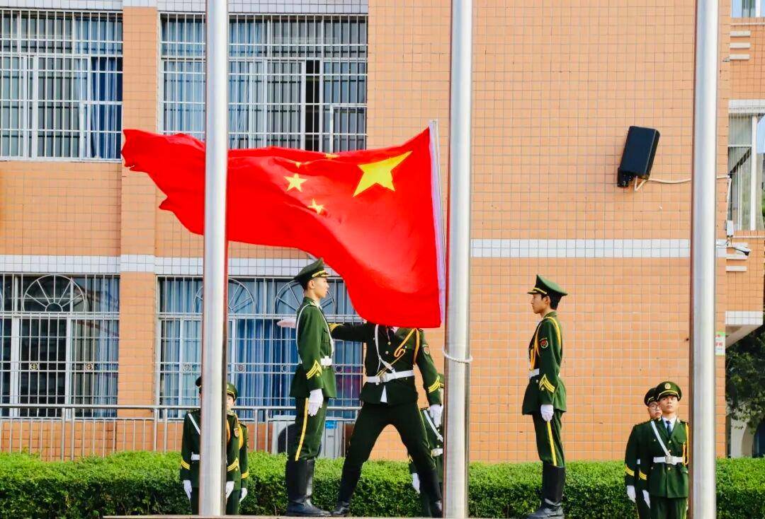 英姿飒爽的国旗护卫队步伐整齐、气宇轩昂,护卫着鲜艳的五星红旗正步走向升旗台。伴随着雄壮激昂的《义勇军进行曲》,五星红旗冉冉升起,迎风飘扬。全体师生肃立凝视,向国旗行注目礼,眼中饱含着对祖国的深切热爱与崇高敬意。