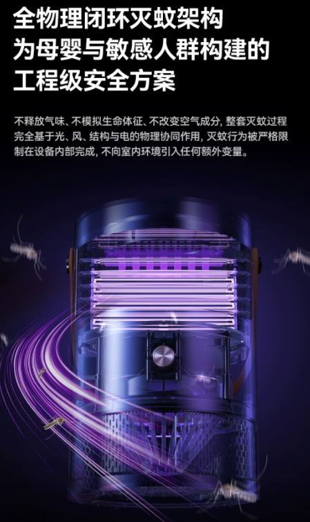 盛夏蚊虫高发,居家防蚊成为全民刚需,尤其婴幼儿、孕期女性、养宠家庭及过敏体质人群,既要杜绝蚊虫叮咬扰眠与健康隐患,又要规避传统化学驱蚊药剂刺激、刺鼻残留的安全问题。市面多数常规灭蚊产品仅靠单一光源、简易气味诱蚊,抗环境干扰差、诱蚊不准、蚊虫易逃逸、消杀不稳定,长期使用效果大幅衰减,行业长期陷入低效、不安全的双重困境。